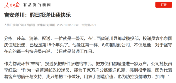 分拣、装车、消杀、配送,一忙就是一整天。在江西省遂川县邮政揽投部,投递员袁小泉国庆值班投递,已经是第18个年头了。他像往常一样,6点准时到公司,不仅是他,对于坚守在岗的每一名快递员来说,节日就是普通工作日。