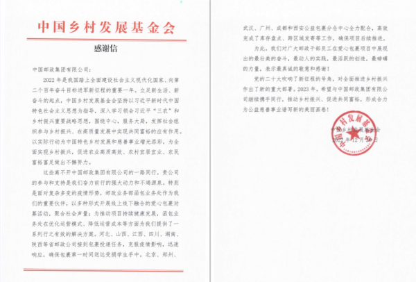 近日,中国乡村发展基金会和中共抚州市委、抚州市人民政府分别致信中国邮政集团有限公司,感谢中国邮政及其相关单位在乡村振兴、公益慈善、疫情防控、保通保畅、服务地方经济社会发展等方面给予的大力支持表示感谢!