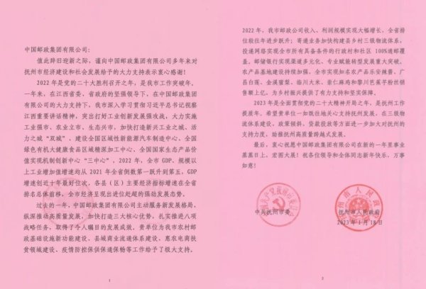 中共抚州市委、抚州市人民政府在感谢信中说,过去的一年,中国邮政集团有限公司主动服务新发展格局,纵深推动高质量发展,加快打造三大核心优势,扎实推进八项战略任务,取得了令人瞩目的发展成效。当地邮政企业为抚州市农村邮政基础新功能建设、县域商业流通体系建设、惠农电商扶贫领域建设、疫情防控、保供保通保畅和助力乡村振兴战略等工作给予了有力支持和坚实保障。