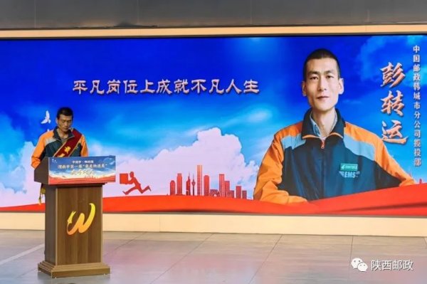 在近日由渭南市邮政管理局、渭南市总工会、共青团渭南市委、渭南市寄递业协会联合举办的“中国梦·邮政情”渭南市第一届最美快递员发布仪式上,渭南韩城市分公司投递员彭转运被授予“最美快递员”荣誉称号并上台发言。