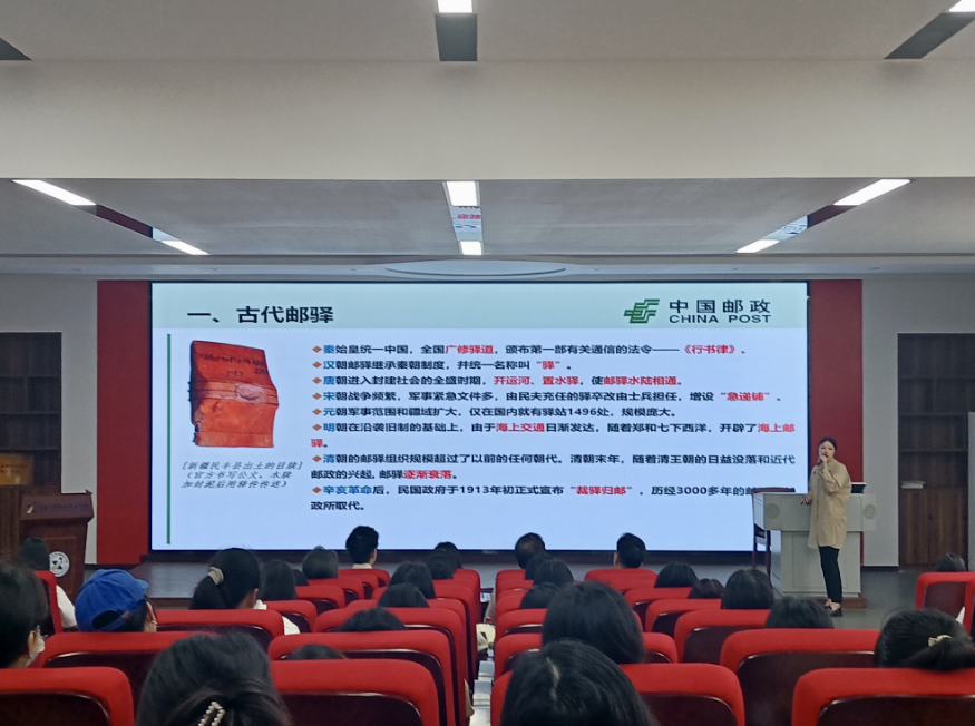 专题讲座现场,工作人员分别为在场学生带来《中国邮政发展史》与《国门生物安全知识科普》的相关主题讲座,现场学习氛围浓厚,互动精彩热烈。在中国邮政的发展史课程上,邮政工作人员讲述了从古代邮驿到现代邮政、从烽火台、驿站、海关代兼邮政、大清邮政一直到现代邮政的变化,邮政品牌的历史变迁与深刻内涵让每一位聆听者丰富了对邮政企业的认知与理解。
