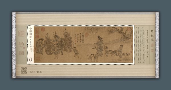 《货郎图》原画笔致工细,画法写实,雕刻师布线细密绵长,细劲的笔势将神情刻画入微,这些都通过公司最新引进的激光直雕机得到高度还原。雕刻的线条明暗虚实调和,蕴藏着丰富的色彩特性,邮票方寸画面分毫毕现、栩栩如生,得以延展出更多可能。专棕、专米、特种金等古画用色,赋予画卷铺展开来的透亮感。经过激光雕刻后精心印刷的《货郎图》邮票,肌理延展自如、清晰顺畅。色泽古朴庄雅,完美呈现了丝绢古画的质感。