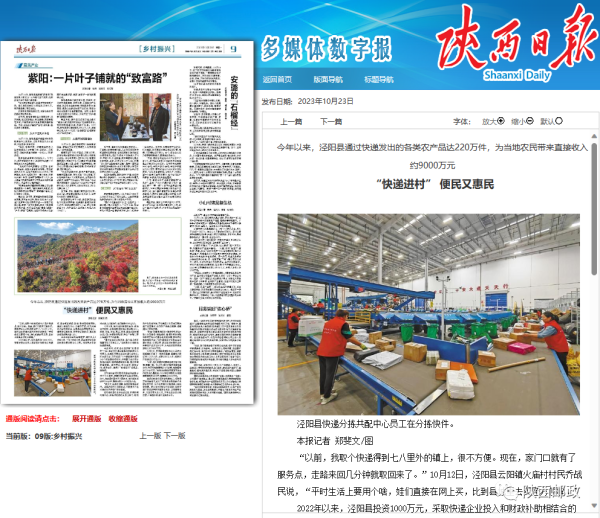10月23日,《陕西日报》9版乡村振兴版刊发文章《“快递进村” 便民又惠民》,专题报道了邮政企业加快邮快合作,规范农产品寄递市场,不断满足农村地区群众生产生活需求,提升快递行业服务水平的优秀案例。