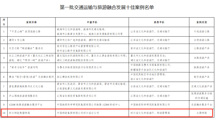 近日,文化和旅游部、交通运输部、国家铁路局、中国民航局、国家邮政局、国铁集团共同遴选出第一批交通运输与旅游融合发展十佳案例10个和典型案例36个。由四川省文化和旅游厅、四川省邮政管理局推荐申报的“四川邮政熊猫邮局”(以下简称为“熊猫邮局”)获评十佳案例,成为全国邮政管理系统参选案例中唯一获此殊荣的案例。