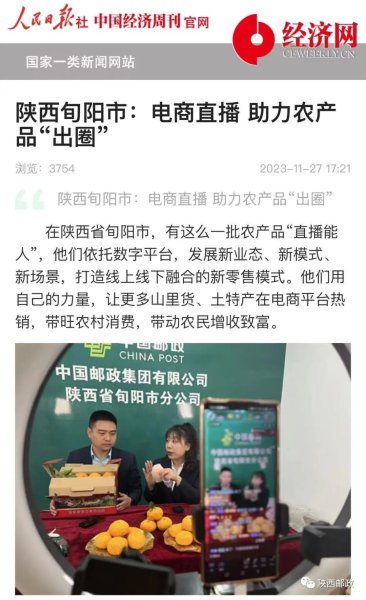 11月27日,人民日报社中国经济周刊官网又以《陕西旬阳市:电商直播助力农产品“出圈”》为题,对旬阳邮政助农直播进行了报道。人民日报客户端、新华社客户端、光明网、中国经济网等媒体报道及转载70余篇次。