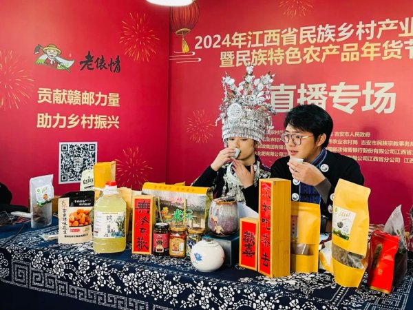 作为此次活动协办单位之一,江西邮政前期通过“庐陵邮雁”平台帮助峡江县政府发放10万元消费券用于线下消费,当天在现场搭建了线上直播间,上架了来自全省8个民族乡及所在市县的60多款农产品。形式多样的优惠活动把民族乡村优质农特产品推介给全国各地的消费者,让大家不出家门也能共享具有民族特色的“江西年货”,直播销售额完成 63万元。