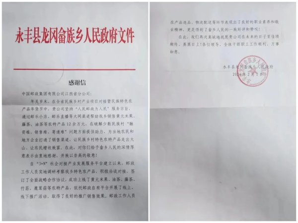 近日,吉安市永丰县龙冈畲族乡人民政府向省分公司发来感谢信,对江西邮政在全省民族乡村产业项目对接暨民族特色农产品年货节中,坚持“人民邮政为人民”服务宗旨,通过邮乐小店、邮乐直播等大网渠道帮助销售黄元米果、藤茶、油茶等农特产品,在破解少数民族村“融资难、销售难、寄递难”问题方面提供助力,为当地农民和地方企业打通销售渠道,让民族乡村特色农特产品走出大山、让畲乡人民增收致富表示由衷地感谢和崇高敬意。感谢信还说,江西邮政积极搭建“3+ N”社企对接产业发展服务平台,与龙冈畲族乡签订了全面战略合作协议,依托邮政自有平台开展线上线下推广活动,取得了良好的推广销售效果。邮政员工在产品选品、物流配送等环节表现出了良好的职业素养和敬业精神。
