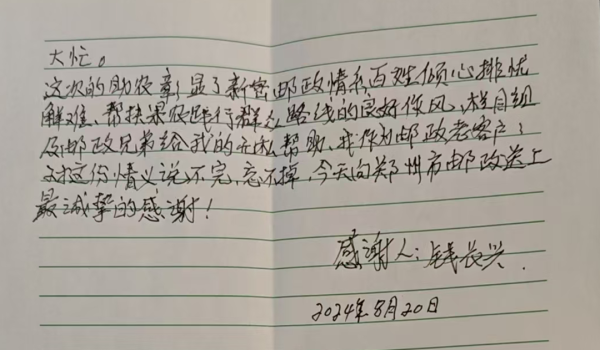 “感谢邮政助农团队帮我联系客户,解决了我蟠桃滞销的燃眉之急。”8月21日,郑州市邮政分公司收到了新密市米村镇马垌村的钱长兴大爷寄来的感谢信。在信中,钱大爷称赞新密市邮政分公司助农团队仅用3天时间,就帮助其销售了6000多斤蟠桃,解决了“卖难”问题。