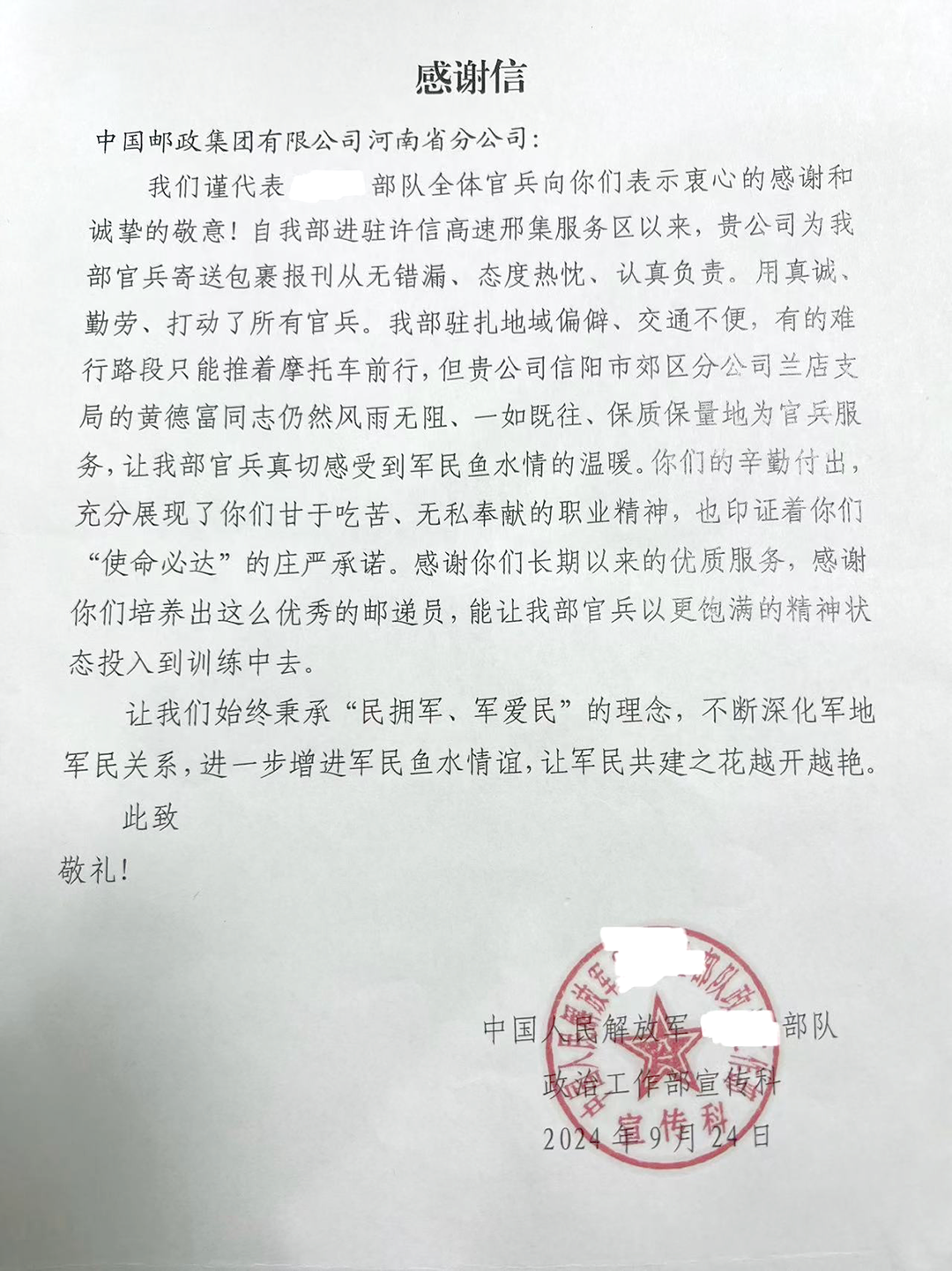 近日,信阳市邮政分公司收到了解放军某部队和一位八旬老人寄来的感谢信。在信中,信阳邮政揽投员黄德富和蔡旺不忘初心、风雨无阻、甘于吃苦、无私奉献的工作态度,得到了用户称赞。