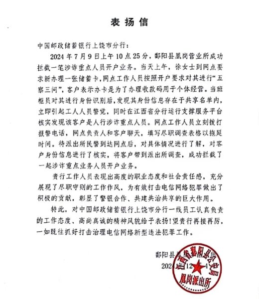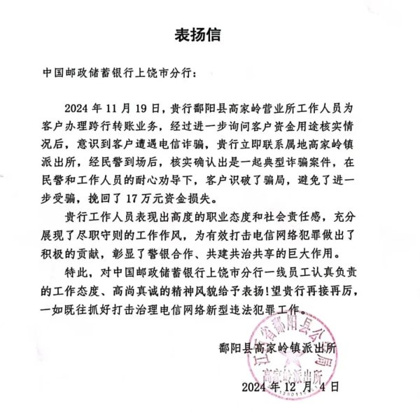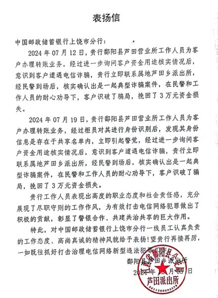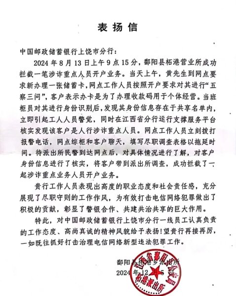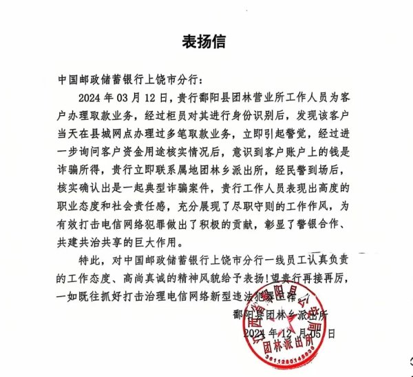 近期,鄱阳县分公司连续收到5封表扬信,团林、柘港、芦田、凰岗、高家岭地方派出所对鄱阳邮政在反诈工作中的表现表示认可和感谢。