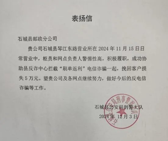 12月3日,石城县公安局刑警大队给石城县分公司发来表扬信,对邮政工作人员以高度的警惕性和责任感,为客户避免了5万元的损失进行充分肯定。