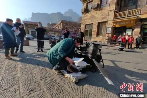 图为无人机“邮递员”降落在林州石板岩镇中心广场。 张俊军 摄