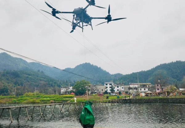 3月30日,在婺源县江湾镇,一架邮政无人机携带重约20公斤装有当日党报党刊、信件及快递包裹的大邮包腾空而起,直飞目的地江湾镇大潋村村委会。10分钟后,无人机徐徐降落在指定位置,圆满完成首次投递,标志着上饶邮政无人机投递在婺源江湾试飞成功。