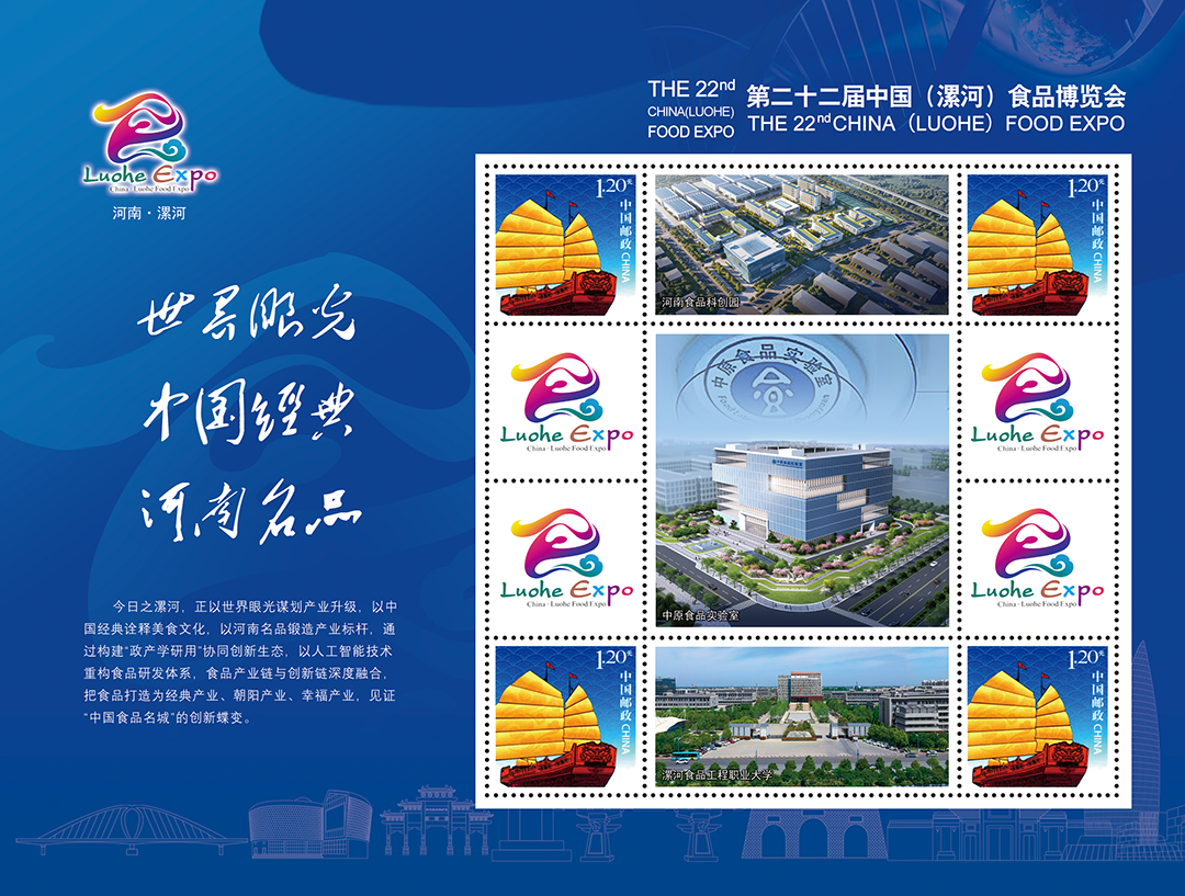 《世界眼光 中国经典 河南名品》第二十二届中国(漯河)食品博览会邮票采用小全张版式,整版邮票一套四枚,以科技蓝为主色调,清新典雅、端庄大气。邮资图为“一帆风顺”,满载着漯河人民对四海宾朋的深切祝愿;附图分别为“食品博览会会徽”“河南食品科创园”“中原食品实验室”“漯河食品工程职业大学”;边饰为第二十二届中国(漯河)食品博览会的主题——世界眼光、中国经典、河南名品;从不同角度展现了漯河食品产业的发展历程。