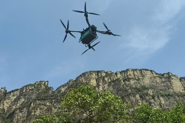 6月17日9时19分,林州市太行大峡谷上空,一架载重50公斤的无人机从石板岩邮政支局出发,飞向了海拔1300米的上坪村。7分钟后,该无人机稳稳降落在了上坪村邮政低空物流驿站。无人机舱门开启,邮件报刊顺利妥投,这也标志着石板岩镇至村的“空中邮路”正式开通,安阳市邮政分公司在全省首次实现偏远山区无人机邮路常态化运营。