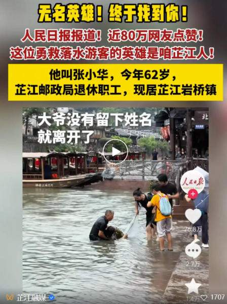 7月23日,湖南凤凰古城沱江边,一名女游客不慎落水。危急时刻,一位白发“大爷”毫不犹豫跳入湍急江中,仅用不到1分钟成功救人,随后默默离开。这一幕被游客拍下并上传网络,迅速引发热议,目前全网点赞已破百万。