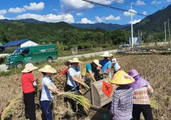 “真是太感谢邮政所的同志们了!要不是你们来帮忙,我这好几亩稻子不知道要收到什么时候,万一碰上雨天,损失就大了!”看着自家田里迅速收割完毕的稻谷,农妇汤阿姨拉着邮政员工的手,激动之情溢于言表。
