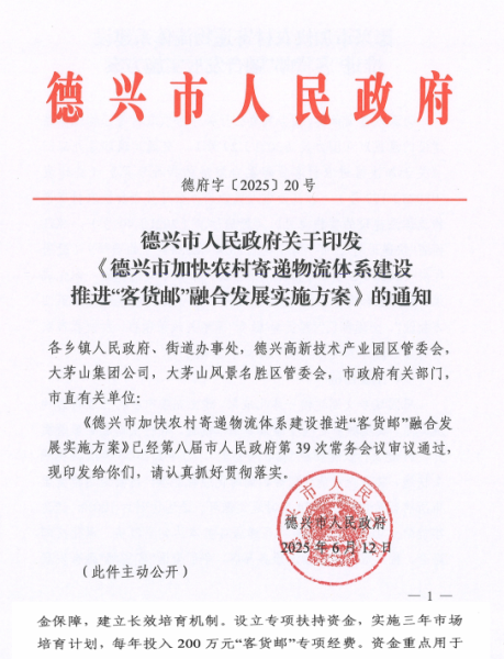 此次中标后,项目将严格遵照《德兴市加快农村寄递物流体系建设推进“客货邮”融合发展实施方案》要求,资金主要用于乡镇网点下沉至村级站点保障兜底补助、分拣、运输企业运营成本补贴,完善县乡村三级物流配送体系,重点深化“快递+公交配送”模式落地,打通农村寄递物流“最后一公里”,畅通农产品出村“最初一公里”。