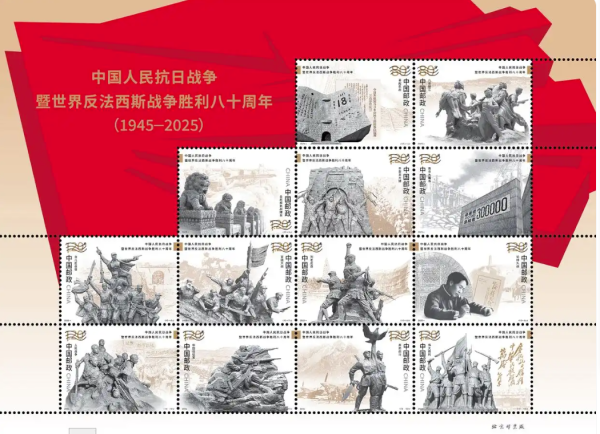 第1至13枚主要表现“铭记历史、缅怀先烈”,邮票图案名称分别为:奋起抗战、八女投江、全民族抗战爆发、平型关大捷、南京大屠杀、台儿庄战役、百团大战、刘老庄连、论持久战、人民战争、中国远征军、并肩战斗、伟大胜利。小型张则以中国人民抗日战争暨世界反法西斯战争胜利80周年纪念活动标识作为主景,寓意“珍爱和平、开创未来”。