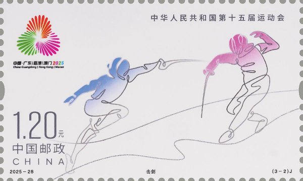 第十五届全运会是粤港澳三地承办的我国规模最大、水平最高、影响最广的综合性运动会,也是香港、澳门首次承办全国运动会。该套邮票由内地、港、澳三地设计师韩家英、陈幼坚、欧俊轩设计。第1枚邮票表现内容为花样游泳,邮票图案以跃动的剪影表现运动员的优雅身姿,力与美相生共舞,以独特的视角展现出运动员在水中的灵动瞬间。第2枚邮票表现内容为击剑,邮票图案以飞动的线条表现运动员迅猛矫健的身姿,刚与柔交织碰撞,以极简的构图展现出运动员激烈的对抗场景。第3枚邮票表现内容为乒乓球,邮票图案以鲜明简练的色块表现运动员蓄势待发的专注之姿,强与韧相融并济,以几何化、概括化的现代极简插画造型,展现出运动员发球瞬间的气势和张力,营造出紧张的比赛氛围。