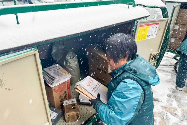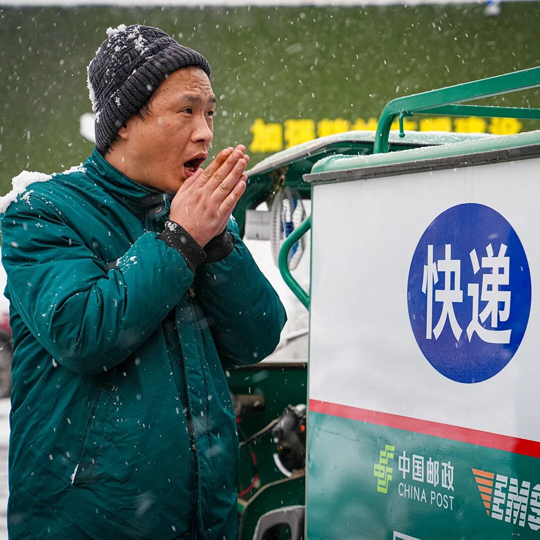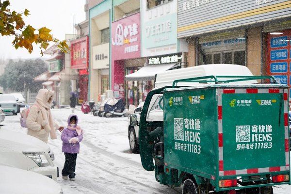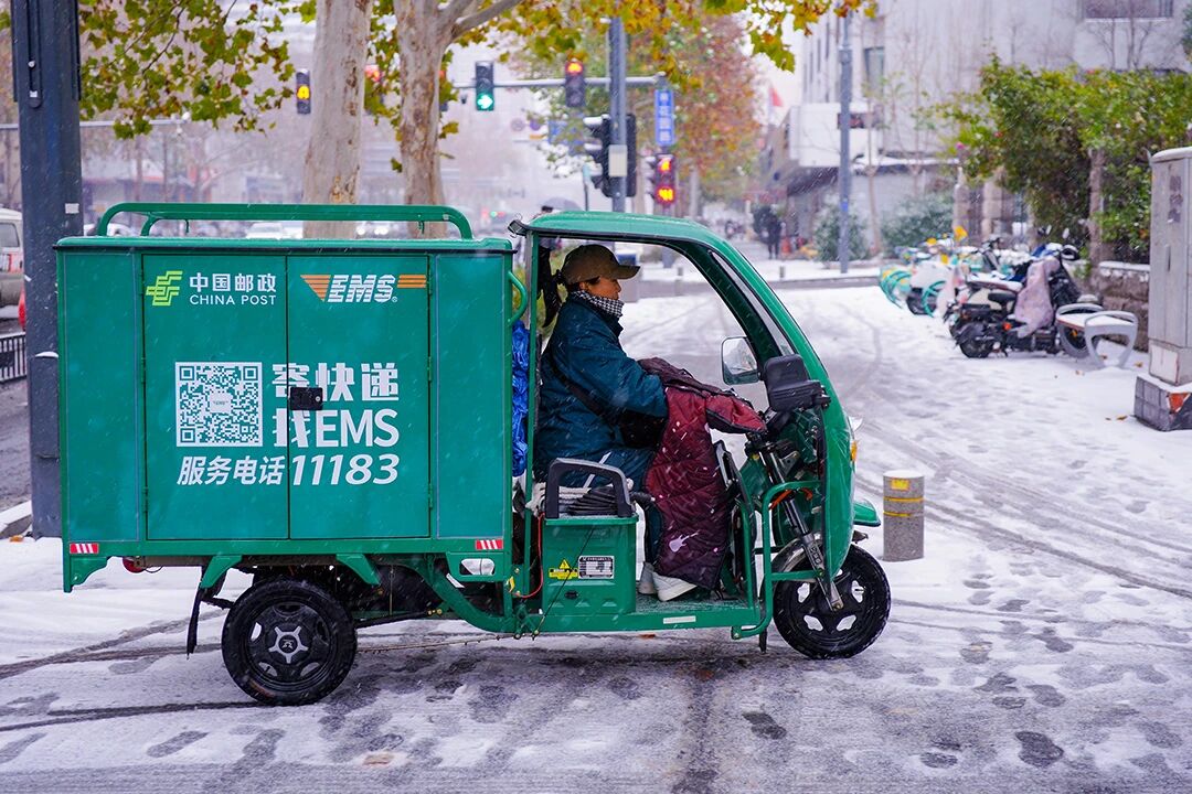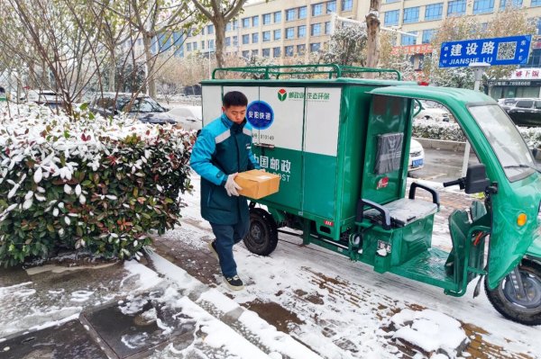 周口市区邮政分公司投递员穿行于银白的街巷,他们的车里装着邮件,当城市因积雪放缓脚步,邮政投递服务却未“打烊”。