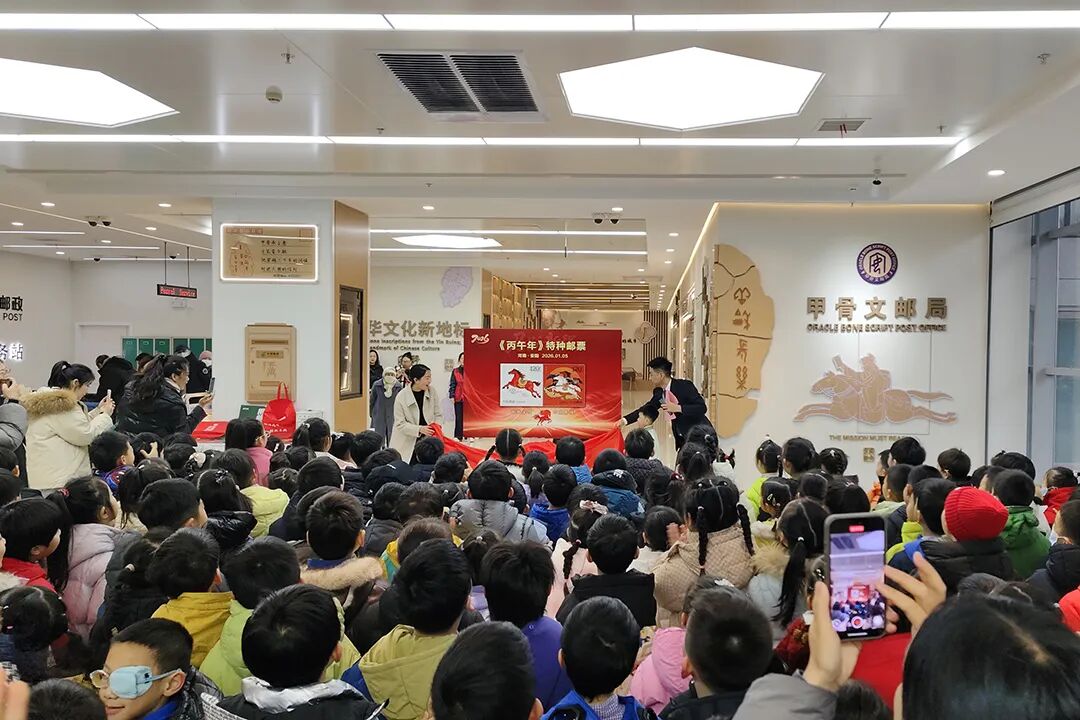 安阳市邮政分公司联合常青藤幼儿园,在甲骨文主题邮局举办了《丙午年》特种邮票发行活动。活动中孩子们与众多资深邮迷欢聚一堂,共同迎接生肖邮票的亮相。此次活动还包含“邮票小课堂”“书写明信片”等环节,在孩子们心中播下了传统文化与邮政情怀的种子。