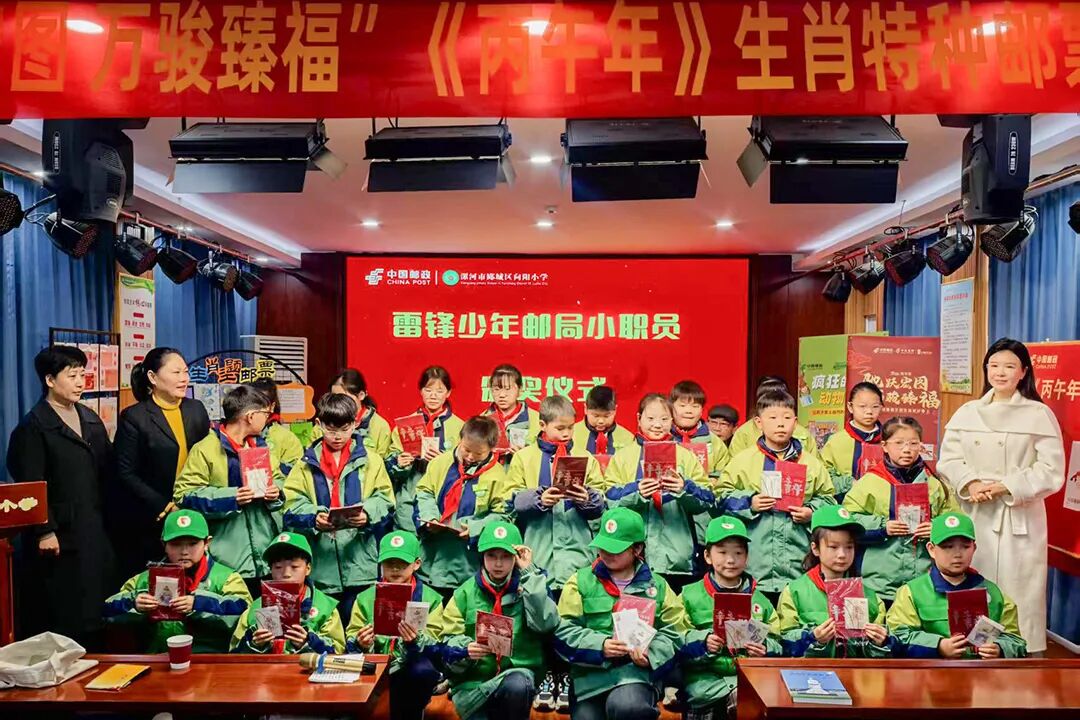 漯河市邮政分公司在向阳小学雷锋少年邮局举办《丙午年》特种邮票首发行仪式,100多名师生和集邮爱好者参与此次活动。活动现场,雷锋少年邮局“小局长”带领团队提供引导服务,特邀嘉宾讲述了集邮故事,开展了集邮知识有奖问答,与师生共同书写带有雷锋主题邮戳的明信片,邮递新年祝福。