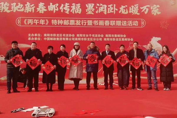 南阳市卧龙区邮政分公司在中州西路支局举办了《丙午年》生肖邮票发行仪式。活动向市民代表赠送了本地书法家题写的福字、春联;为广大邮迷提供冰箱贴、明信片自助打印,盖戳、寄递等服务;设立了马年邮票发行打卡点、红包墙等,营造生肖文化氛围,传递新年祝福。
