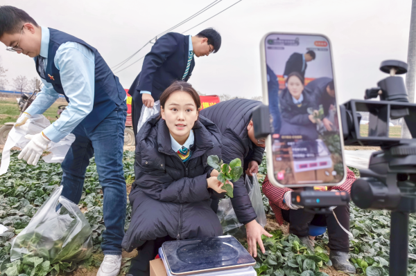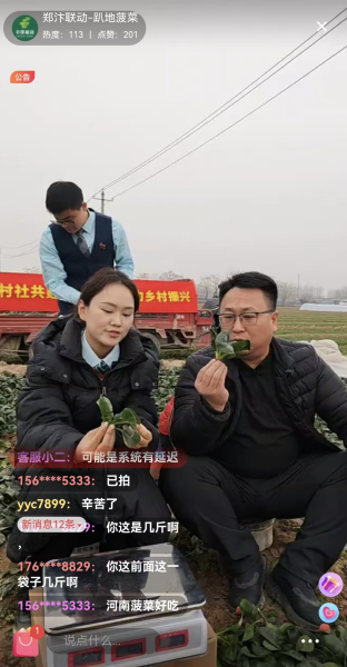 “家人们,欢迎大家走进郑州邮政+开封邮政联合助农直播间,今天我们为大家带来的是被誉为菠菜界‘爱马仕’的‘霜打趴地菠菜’。这种菠菜经秋冬露天霜打,根红叶肥,口感格外甘甜……”