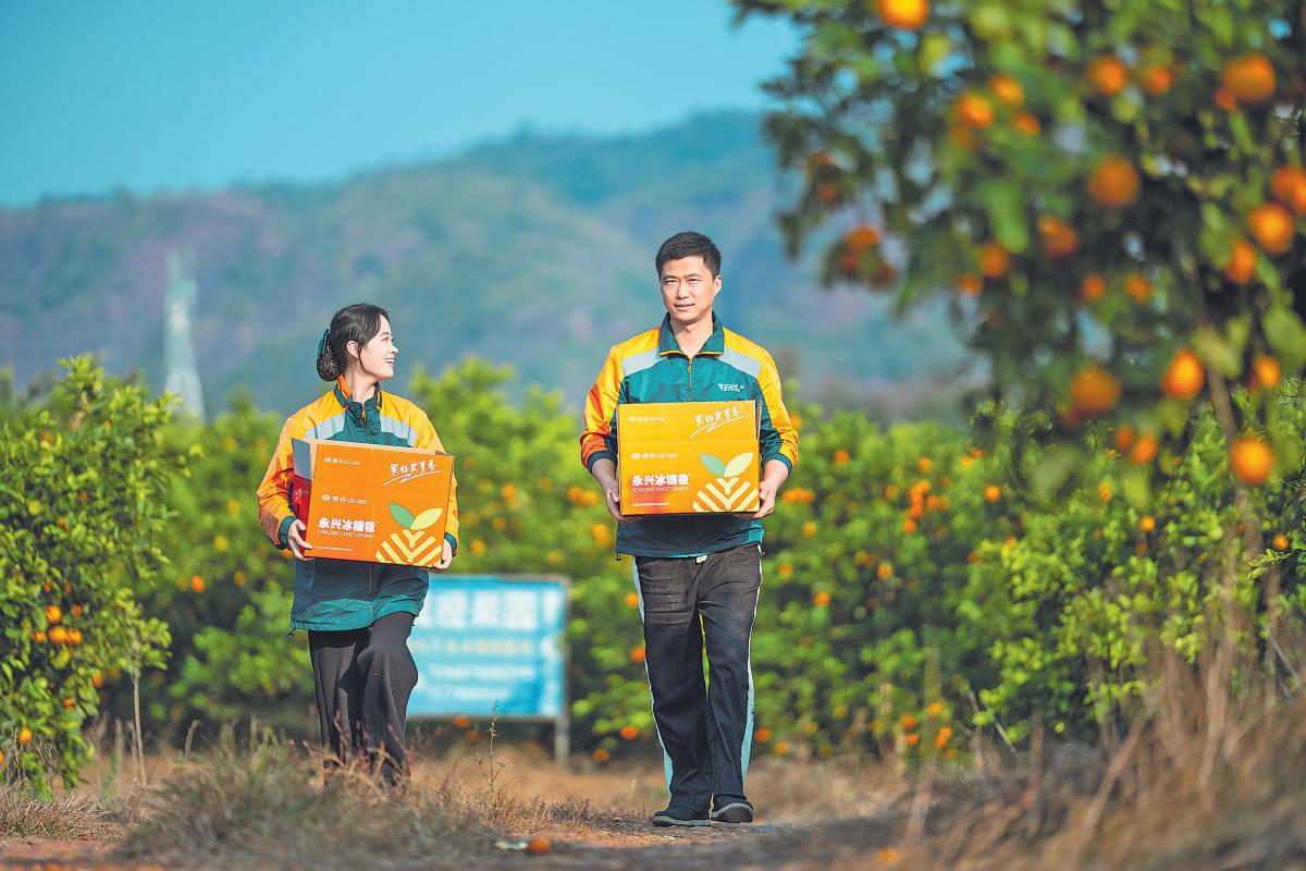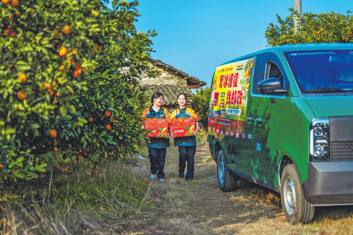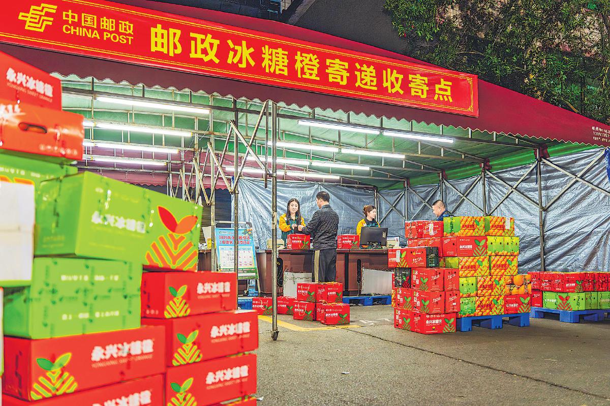 ④ 邮政员工把“最后一百米”缩短到零——走进果农院落,将刚离枝头的冰糖橙直接装车,家门口即刻变“始发站”。