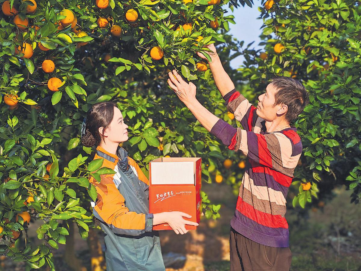 ② 邮政员工化身“橙”意助手,与果农并肩采摘,一箱箱冰糖橙瞬间变成“金果果”。