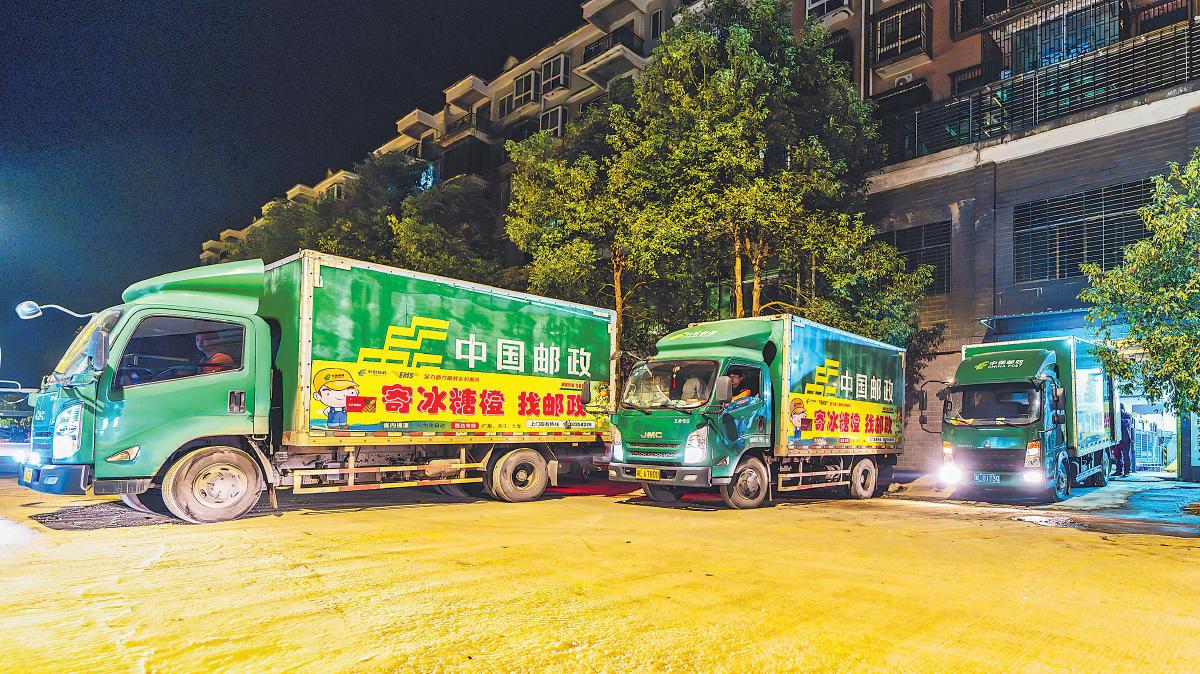⑦ 满载冰糖橙的邮车披星戴月出发,把湘南红壤上的甜蜜送往千家万户。