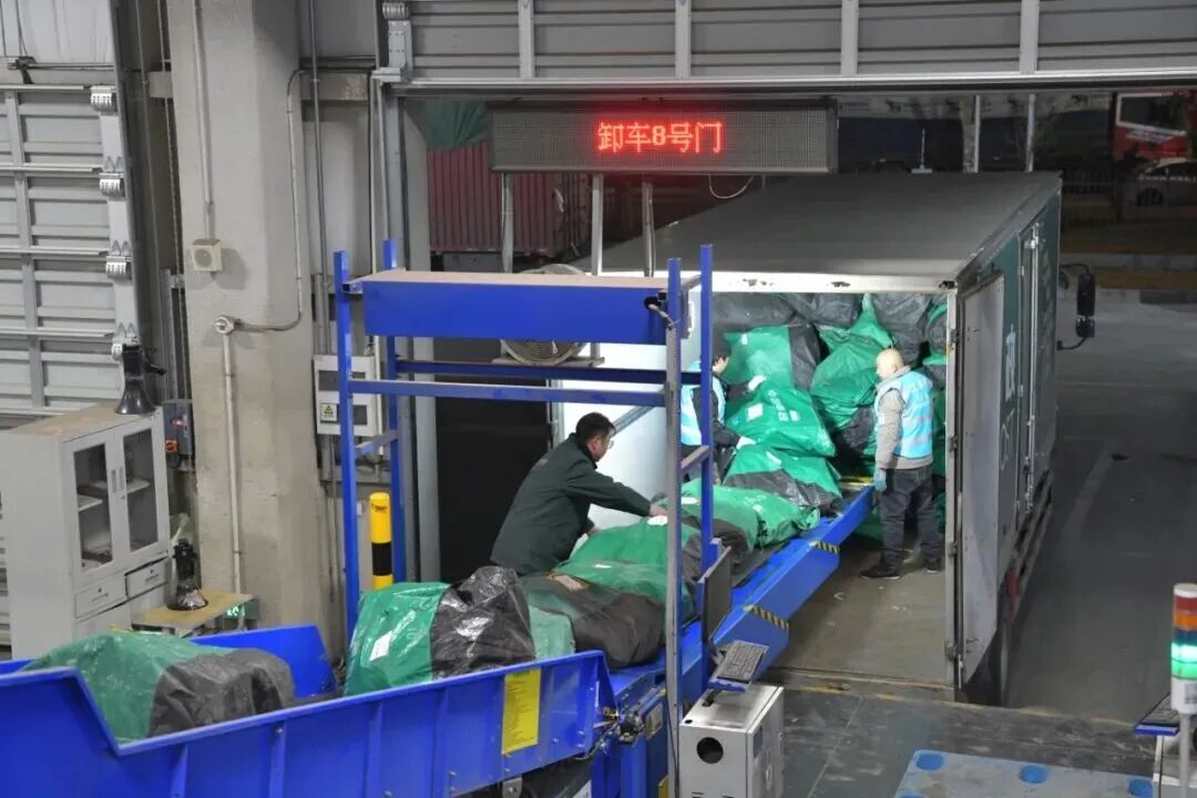 中铁快运工作人员从传输带上将邮包搬下来