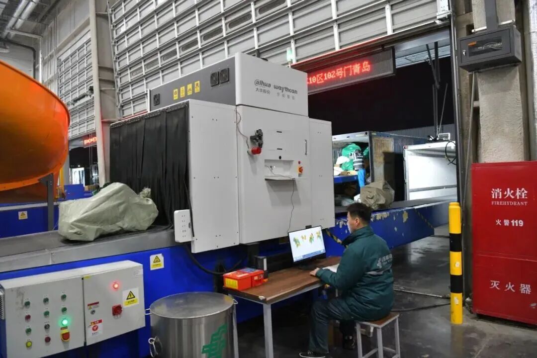 航空港区出口处理场地工作人员对发往青岛方向的邮件进行安检、装车